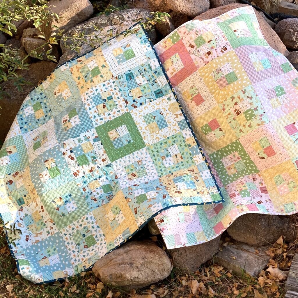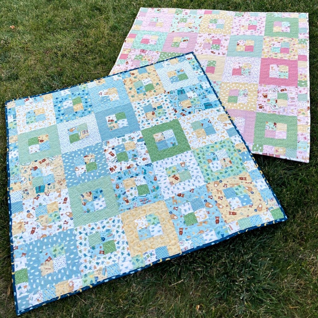 Today, I am thrilled to be sharing these brand new Snuggly Squares quilts along with a Free PDF Pattern for them!!! Snuggly Squares was one of the first quilt tutorials I made clear back in 2010, and when I saw the new Baby Boy / Baby Girl fabrics from Lori Whitlock, I knew it was time to make Snuggly Squares again!!! They are just the perfect fit for this quilt design!! And now, you can make your own as well with the Free Snuggly Squares PDF Pattern!